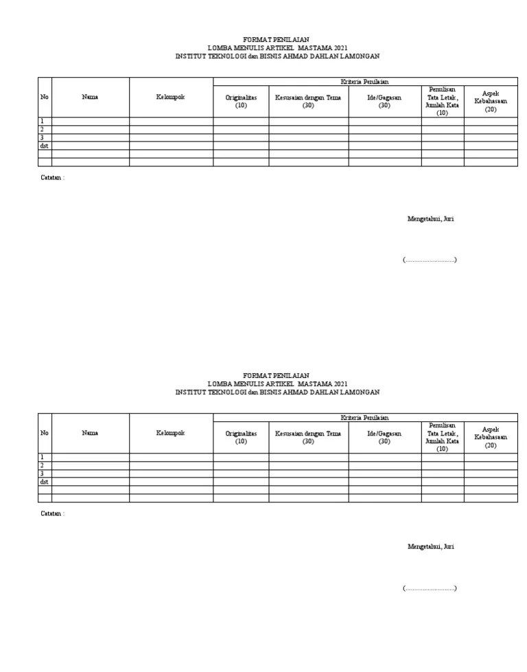 Format makalah (15) tata tulis, tata letak, jumlah halaman, tipografi, kerapihan ketik penggunaan bahasa indonesia yang baik dan benar kesesuaian . Dari kriteria penilaian diatas, tim juri memutuskan pemenang lomba menulis artikel sebagai berikut: Kekuatan cerita (story telling), relevansi dengan tema, keunikan,. Aspek bentuk, kerapian, kesesuaian isi dengan tema, dan gaya penyajian. Kesesuaian naskah dengan tema lomba (40%) juri dari unsur kemdikbud.